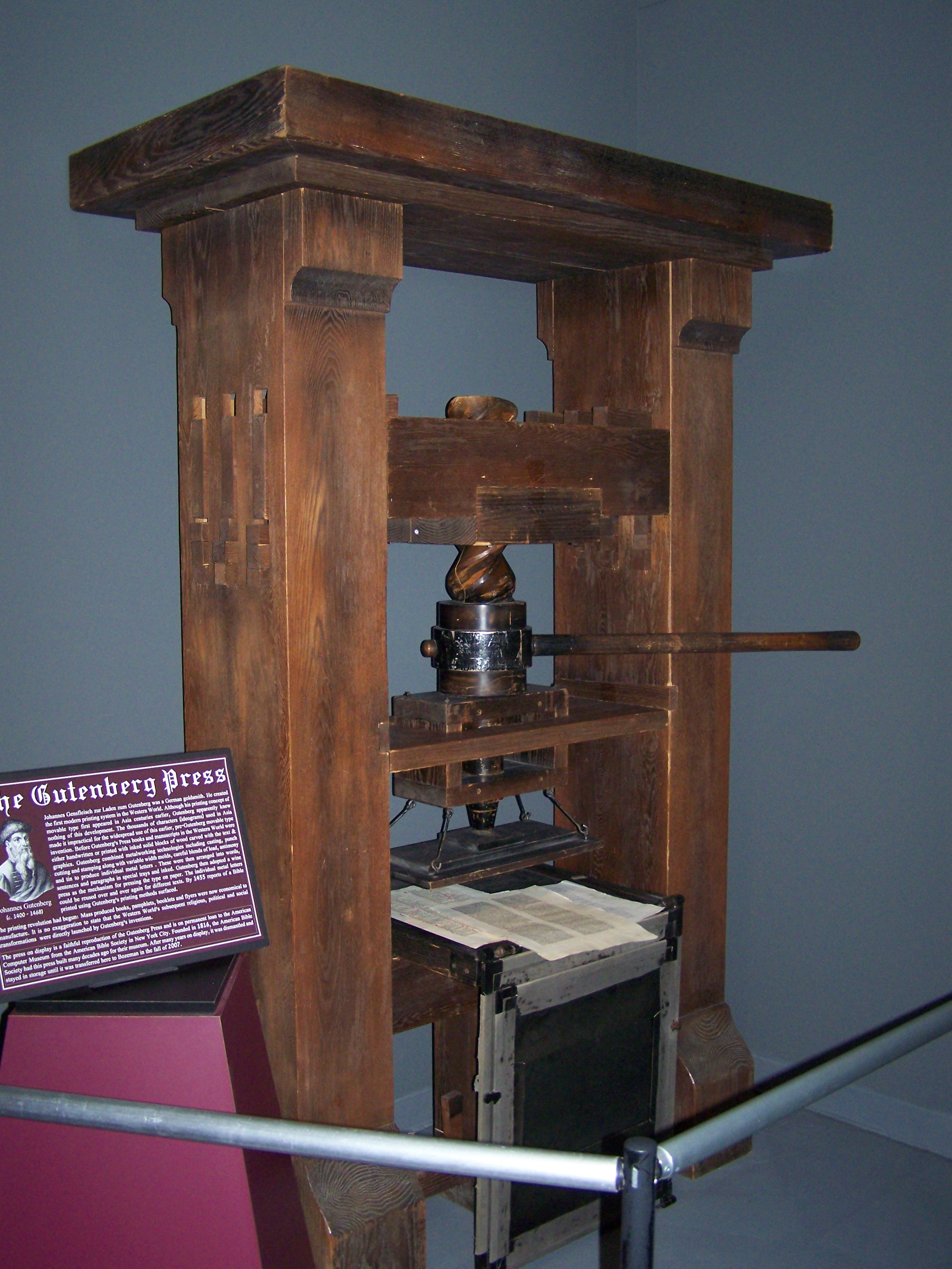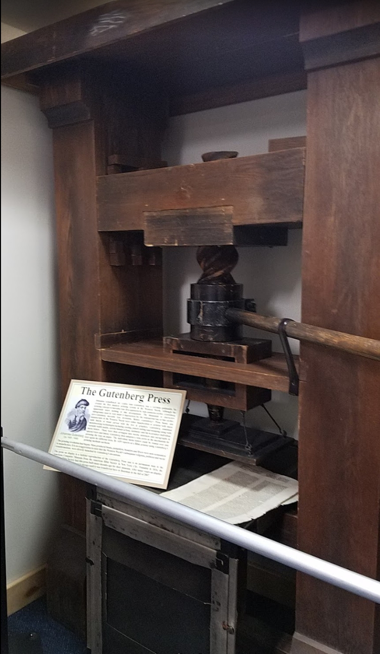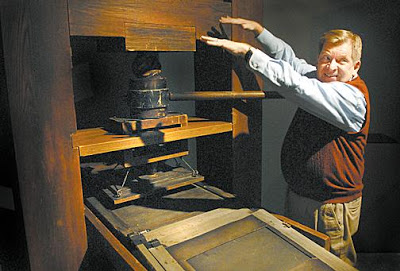 Website (December 24, 2007): “The centerpiece is an 1816 “faithful reproduction” of the original press from the American Bible Society in New York City. “I had a dream about two months ago that I should get a Gutenberg press,” he said. “I got online and found a 10-year-old e-mail on a blog” indicating that the Bible society was looking for a home for the thick, weighty, wooden replica. He got in touch, and it turned out the press hadn’t yet been adopted. One thing led to another and the press was shipped to the museum this fall.”