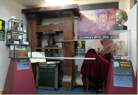 The text on the sign states: “The press on display is a faithful reproduction of the Gutenberg Press and is on permanent loan to the American Computer Museum from the American Bible Society in New York City. Founded in 1816, the American Bible Society had this press built many decades ago for their museum. After many years on display, it was dismantled and stayed in storage until it was transferred here to Bozeman in the fall of 2007.”