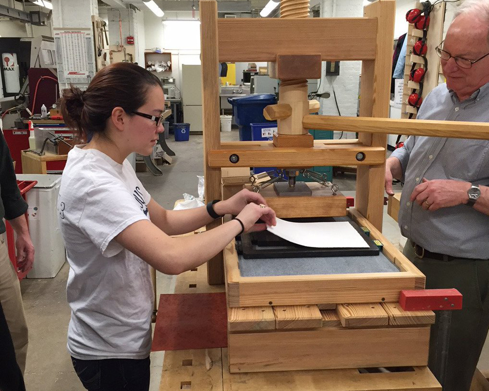 Website: “A school better known for its high-tech achievements has recently focused its students on building a low-tech wooden common press. Ten Massachusetts Institute of Technology students had the chance in Fall 2016 to participate in 21H.343 “Making Books: The Renaissance and Today,” an interdisciplinary class that integrated studies of history, rare books, and printing press construction.”