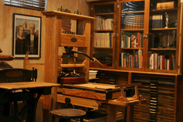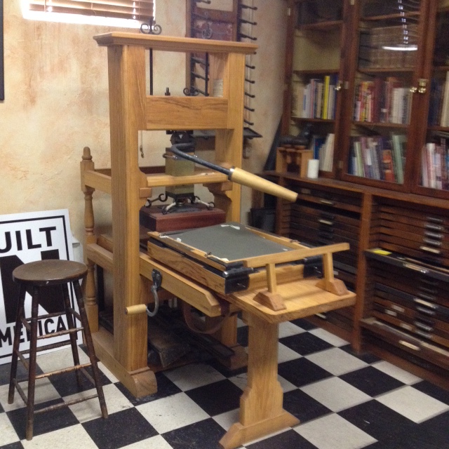 This press is an authentic replica of a 1770’s English Wood Common Press. It is modeled after the Ben Franklin press that is displayed at the Smithsonian. We contracted Steve Pratt, a noted craftsman, to custom build this press for our studio. It took Steve four and a half years to complete the project and it arrived here on July 2, 2007 – just in time to reprint the Declaration of Independence for July 4, 2007!