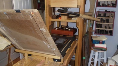 The shop contains three reproductions of English style printing presses. All three are based on the Harris and Sisson (1987) publication.