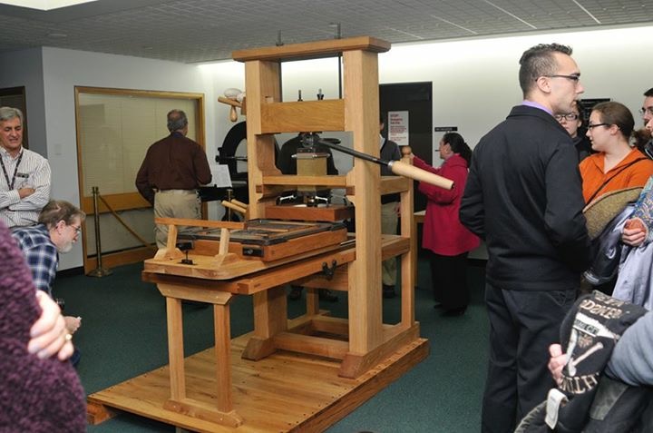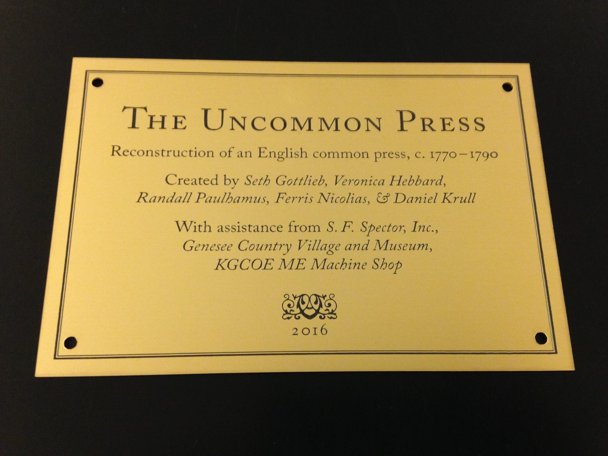 The plaque on the head states: “The Uncommon Press. Reconstruction of an English common press, c. 1770-1790. Created by Seth Gottlieb, Veronica Hebbard, Randall Paulhamus, Ferris Nicolias, & Daniel Krull. With assistance from S.F. Spector, Inc., Genesee Country Village and Museum, KGCOE ME Machine Shop. 2016.”