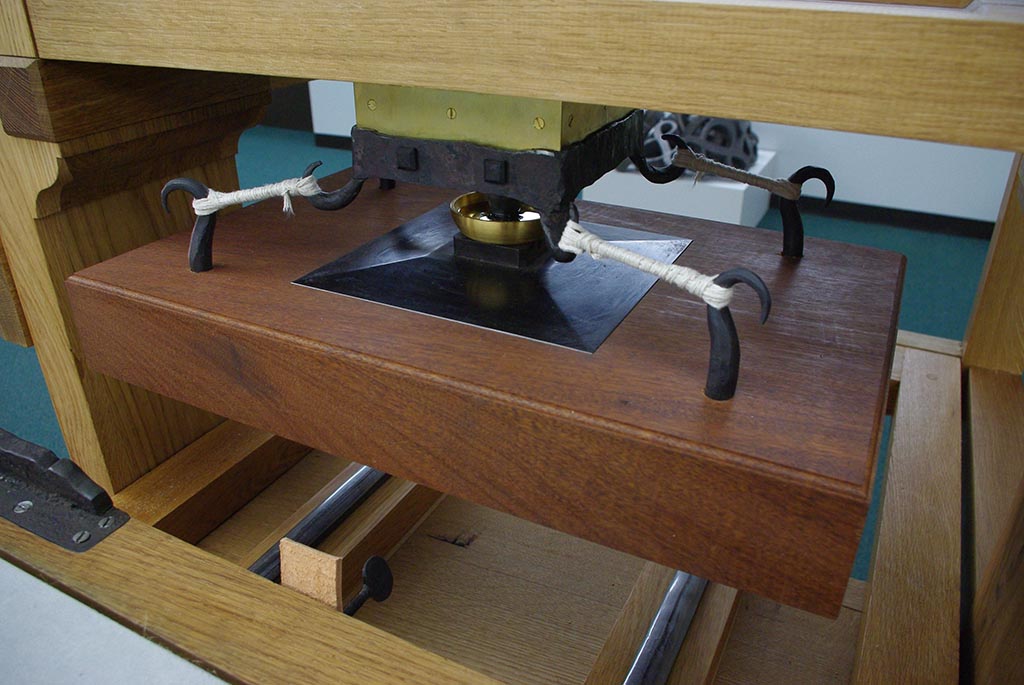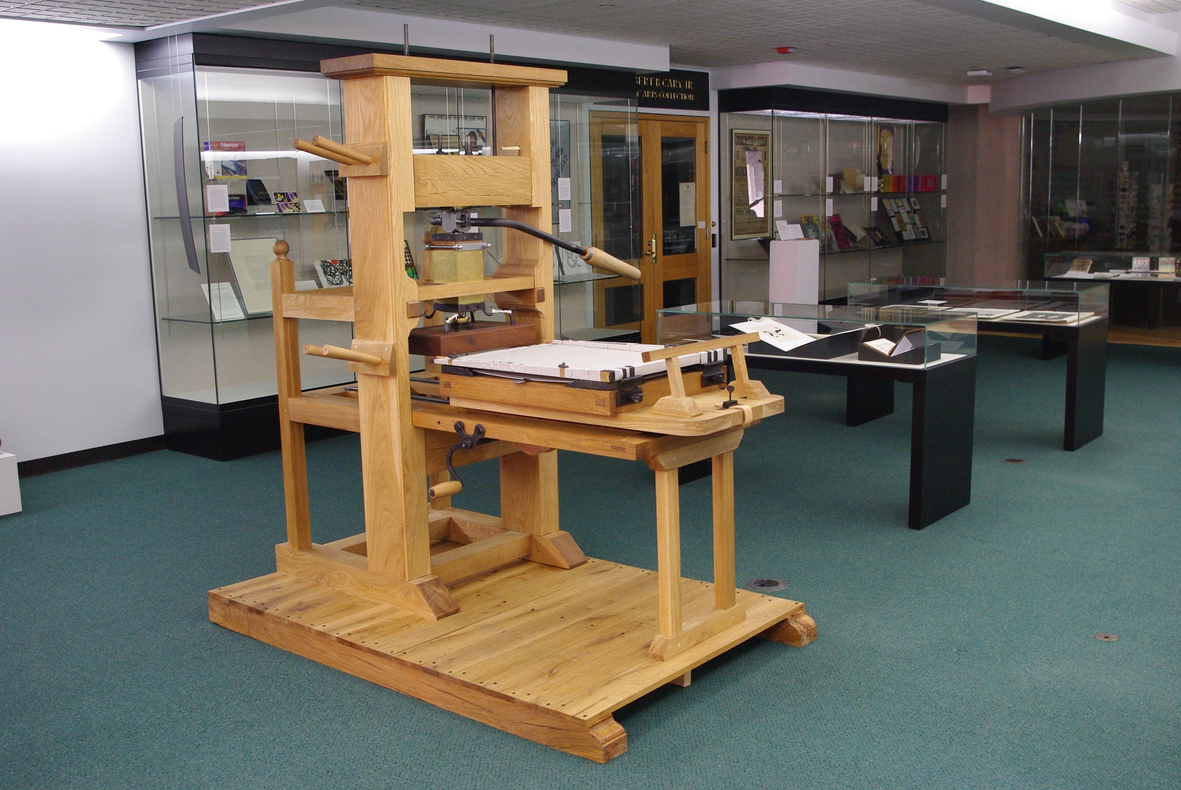 The project is documented in great detail: “The Cary Graphic Arts collection maintains a collection on the history of printing, including a full pressroom with 18 historic presses. Few original wooden common presses still exist; in order to better present the history of printing, the Cary Collection is seeking to have a reconstruction of a wooden press made. The goals of this project are to design a wooden press based upon historical research, to build a press in accordance with this design, and to publish a paper documenting the design and construction processes. The final press must be consistent with original common presses and maintain historical accuracy. This press will function as an original press and be used for instruction at the Cary Collection.”