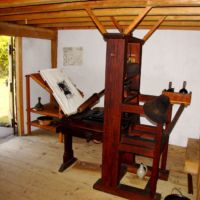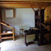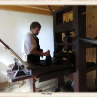 “Working reproduction of the William Nuthead printing press, which was used in the first printing house in the Southern Colonies. This fully functional printing press, located in the Print Shop in the Historic St. Mary’s City living history area, is used to demonstrate the steps printers went through to produce just one sheet of printed paper.”
