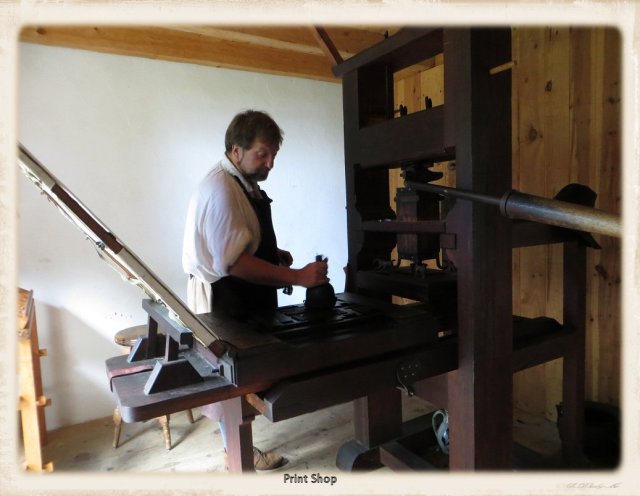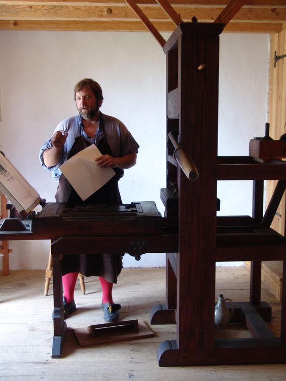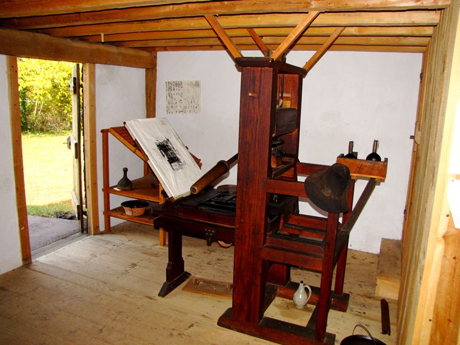 “Working reproduction of the William Nuthead printing press, which was used in the first printing house in the Southern Colonies. This fully functional printing press, located in the Print Shop in the Historic St. Mary’s City living history area, is used to demonstrate the steps printers went through to produce just one sheet of printed paper.”