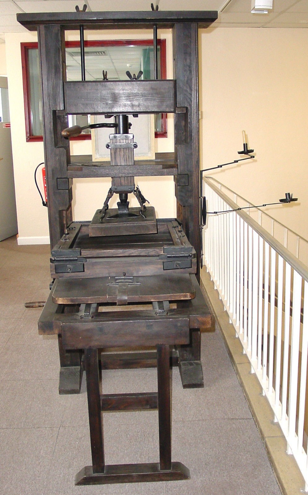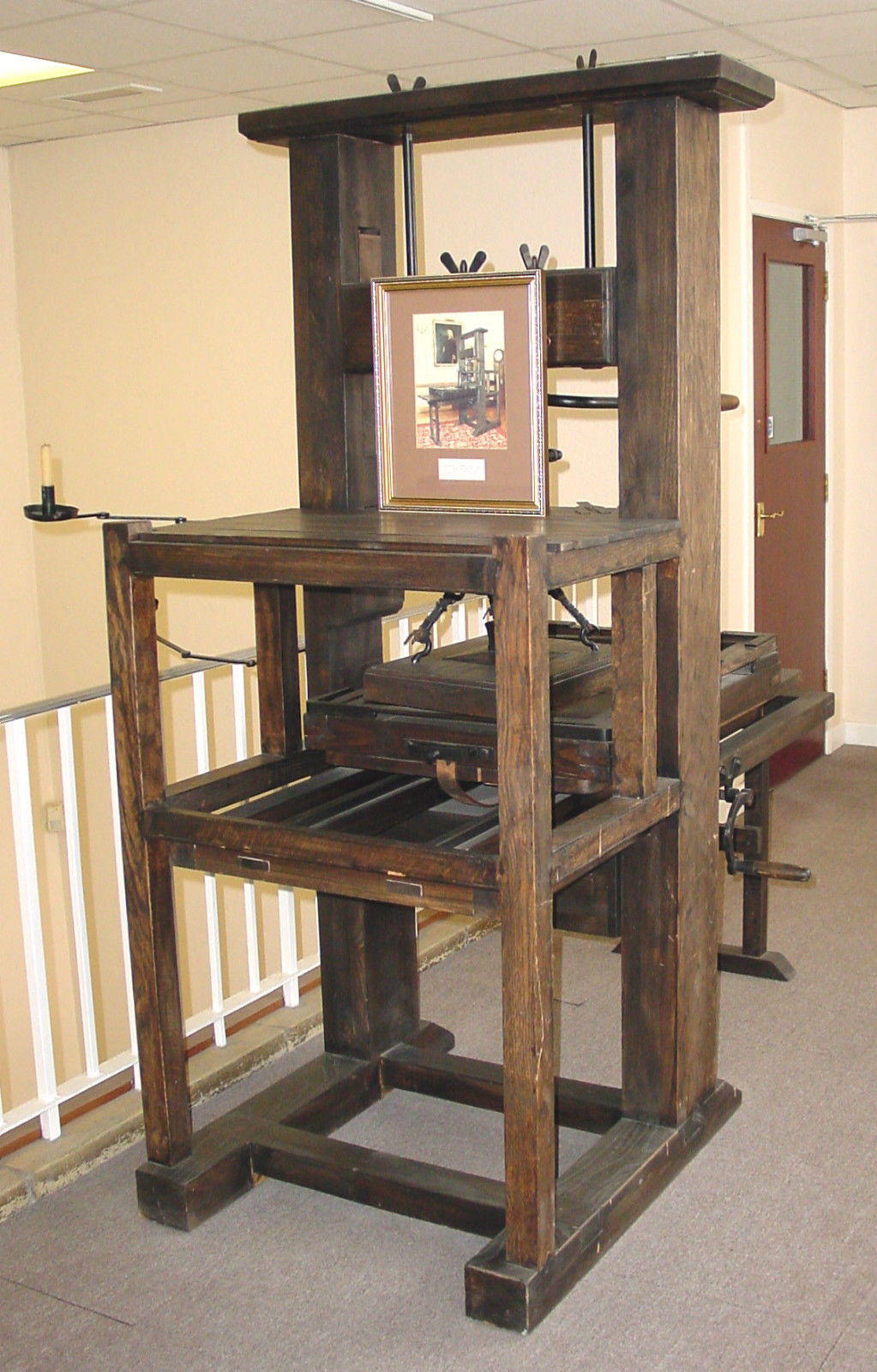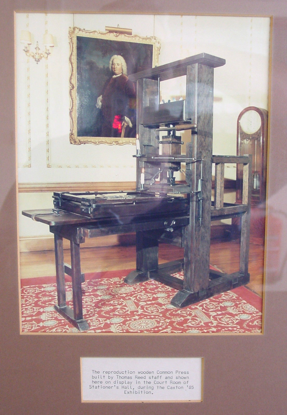 Location: Antwerp Notes: 1. The caption in photo 4 states: ‘The reproduction wooden Common Press built by Thomas Reed staff and shown here on display in the Court Room of Stationer’s Hall, during the Caxton ’85 Exhibition.’ Photographs: medium size. Clicking enlarges in new window.