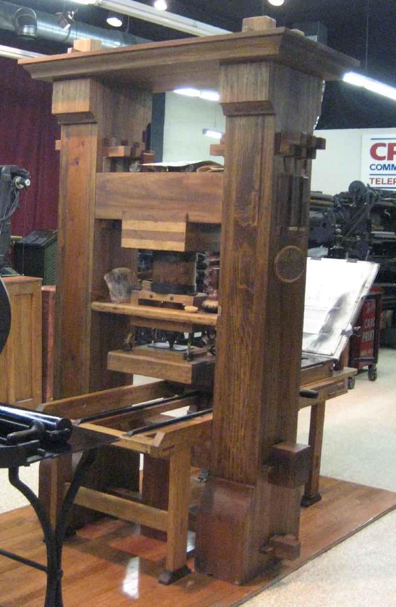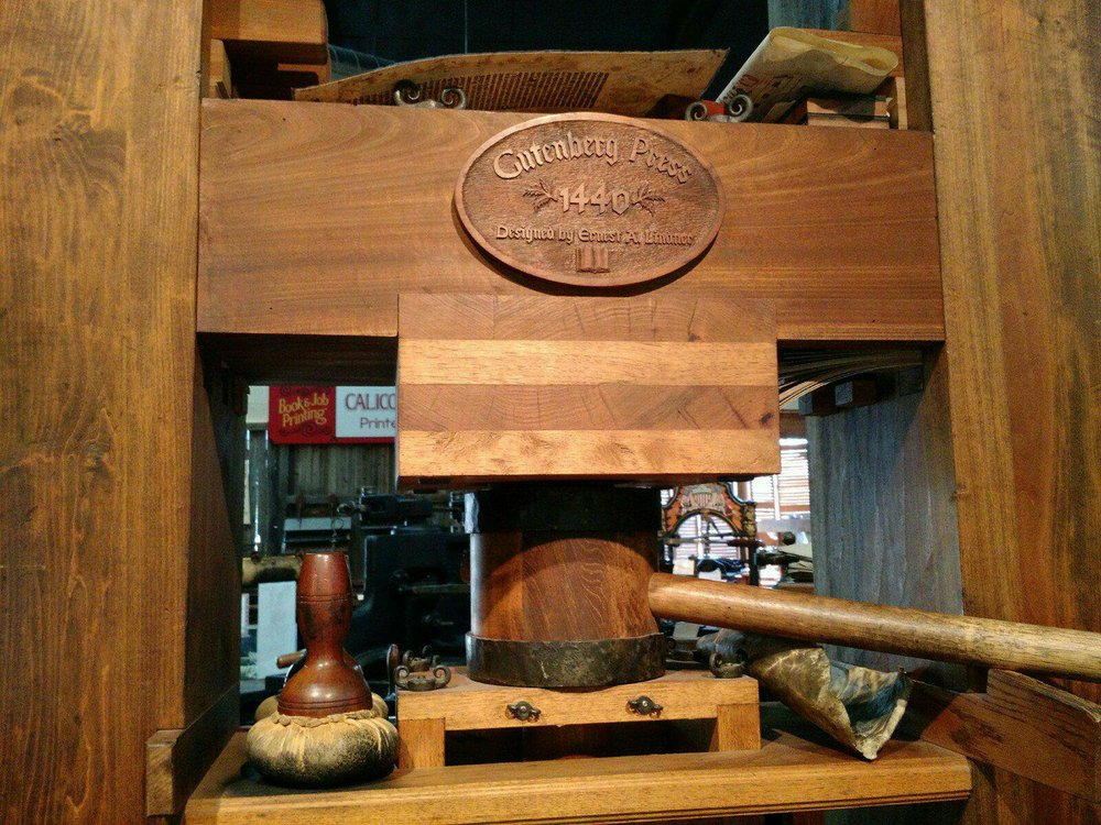 Photo: Peter Small demonstrating the museum's Gutenberg press. [Source]