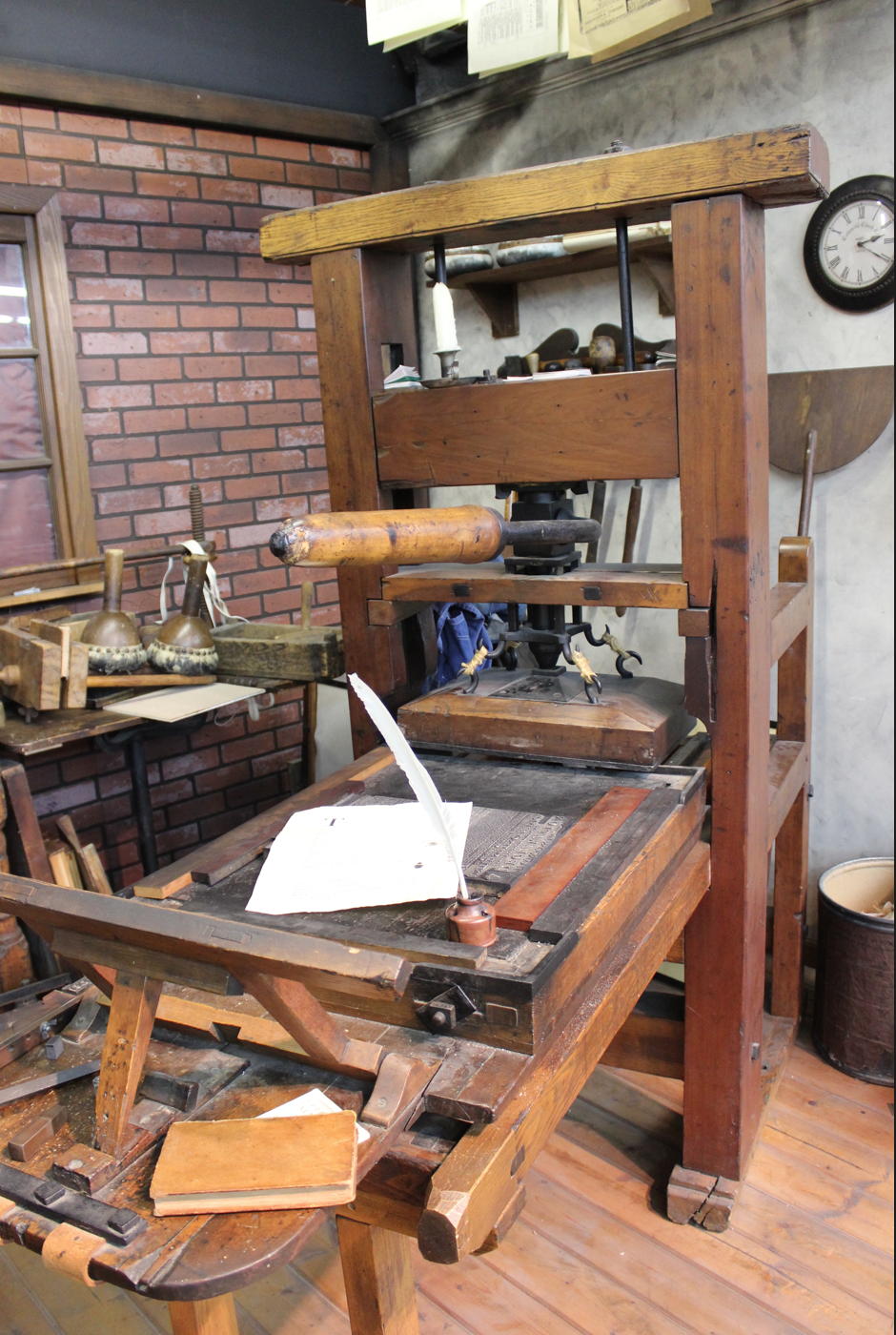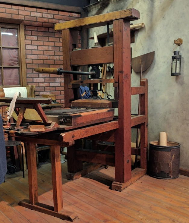 Location: International Printing Museum, 315 W. Torrance Boulevard, Carson, CA 90745. Notes: The Indianapolis Star (January 11, 1953. Page 20): ‘On a trip to Massachusetts for purchase of several items for his company, Mr. Bookwalter saw the old Ramage in the lobby of a firm at Norwood, Mass., 14 miles from Boston. … Mr. Bookwalter finally persuaded owners of the historic press to “loan” it for placing in the reproduction of the Elihu Stout shop at Vincennes when it is ready.’ Philip Gaskell (1956) notes: “A ramage of the 1805-15 period, formerly owned by the Norwood Press.” Gaskell (1970, p 32) mentions: “USA 19. The Bookwalter Company, Indianapolis, Ind.”. He notes: “Stamped ‘Ramage’ on the spindle; formerly owned by the Norwood Press.” The Wayzgoose Gazette (Newsletter of the International Printing Museum, Volume 8, Number 1, July 1998) describes how the Ramage press was acquired in 1998. Page 2: ‘We inquired about the Ramage press and were told it had been crated and moved to Chicago.’ Rand McNally and Ted McNally donated the press to the International printing Museum. Video: ‘Printing on the Ramage press’. It shows International Printing Museum director Mark Barbour printing a copy of the Declaration of Independence on the Ramage Press at the museum. Video by David Crammer, uploaded on July 5, 2009. Literature: Gaskell, Philip. 1956. The Decline of the Common Press. [PhD Thesis]. Cambridge: King’s College. Gaskell, P. 1970. ‘A Census of Wooden Presses’. Journal of the Printing Historical Society. 6. pp 1 – 32. Photographs: medium size. Clicking enlarges in new window.