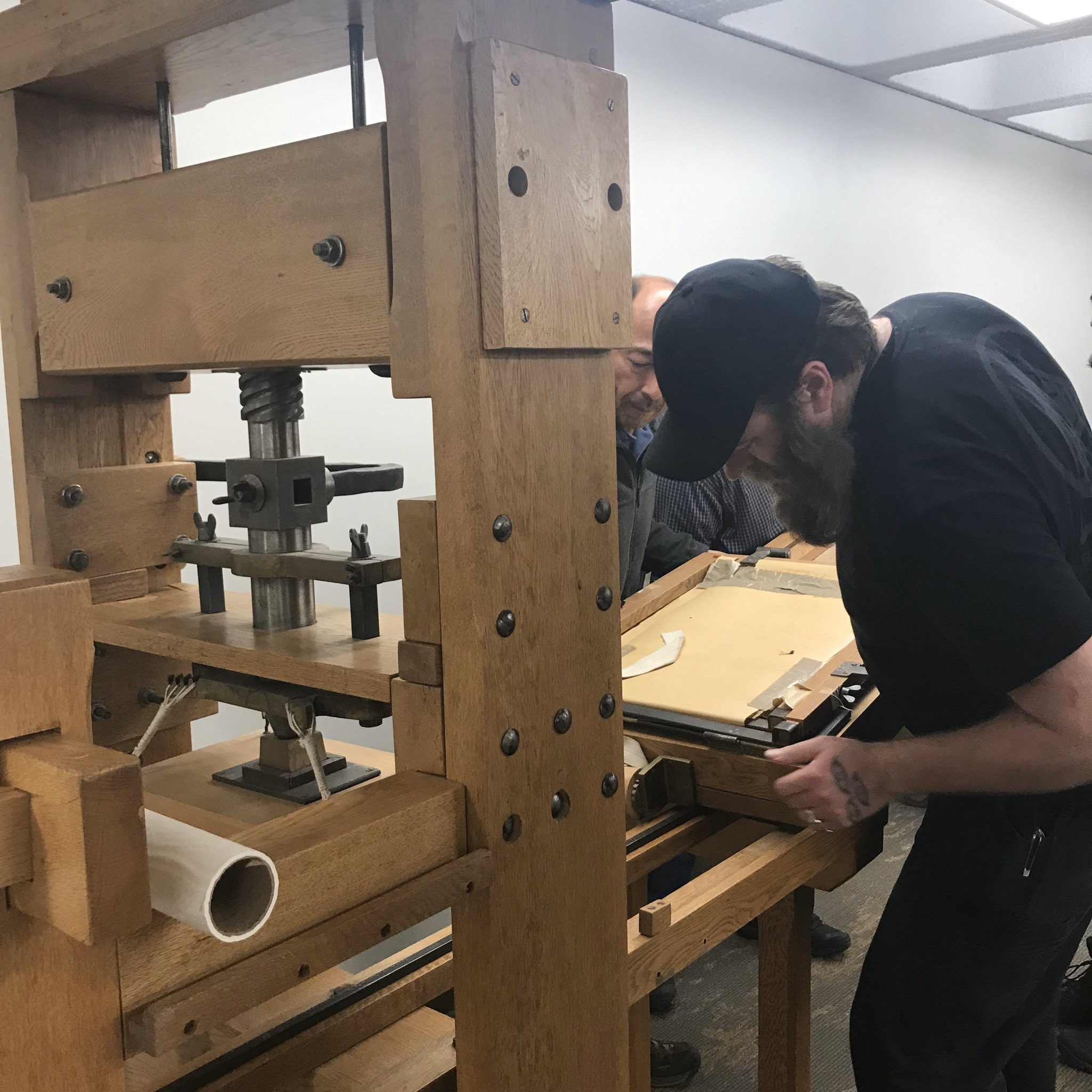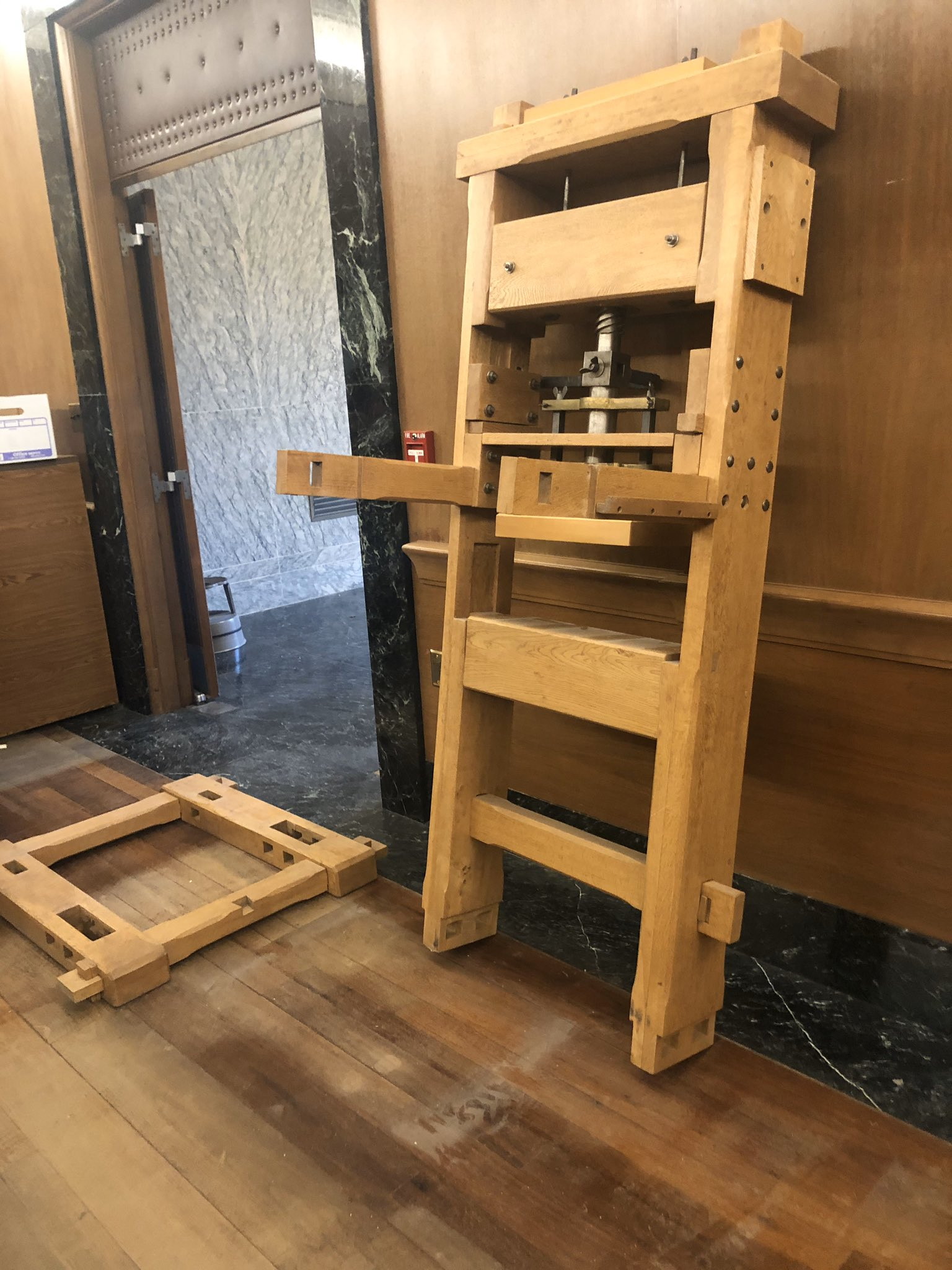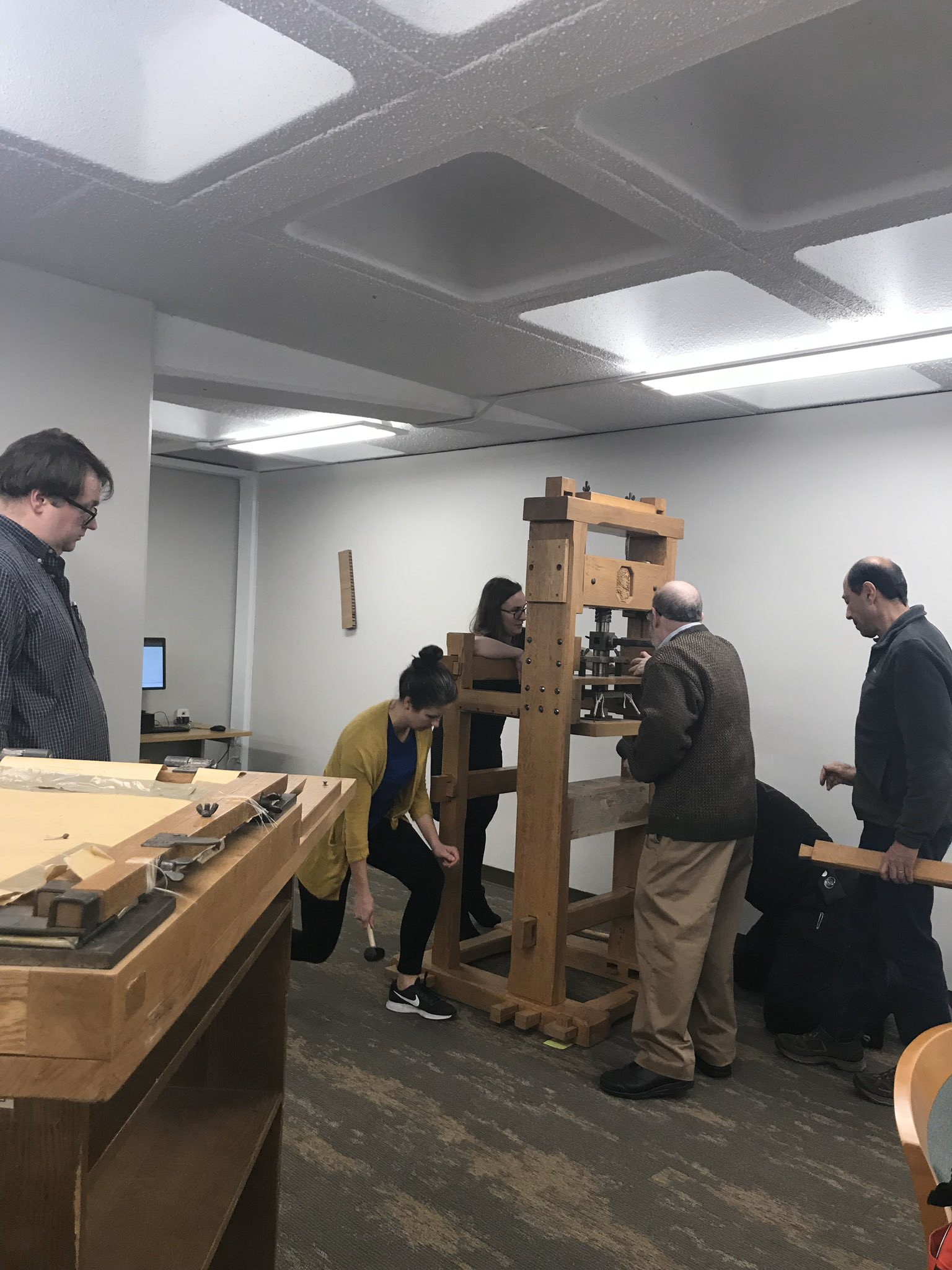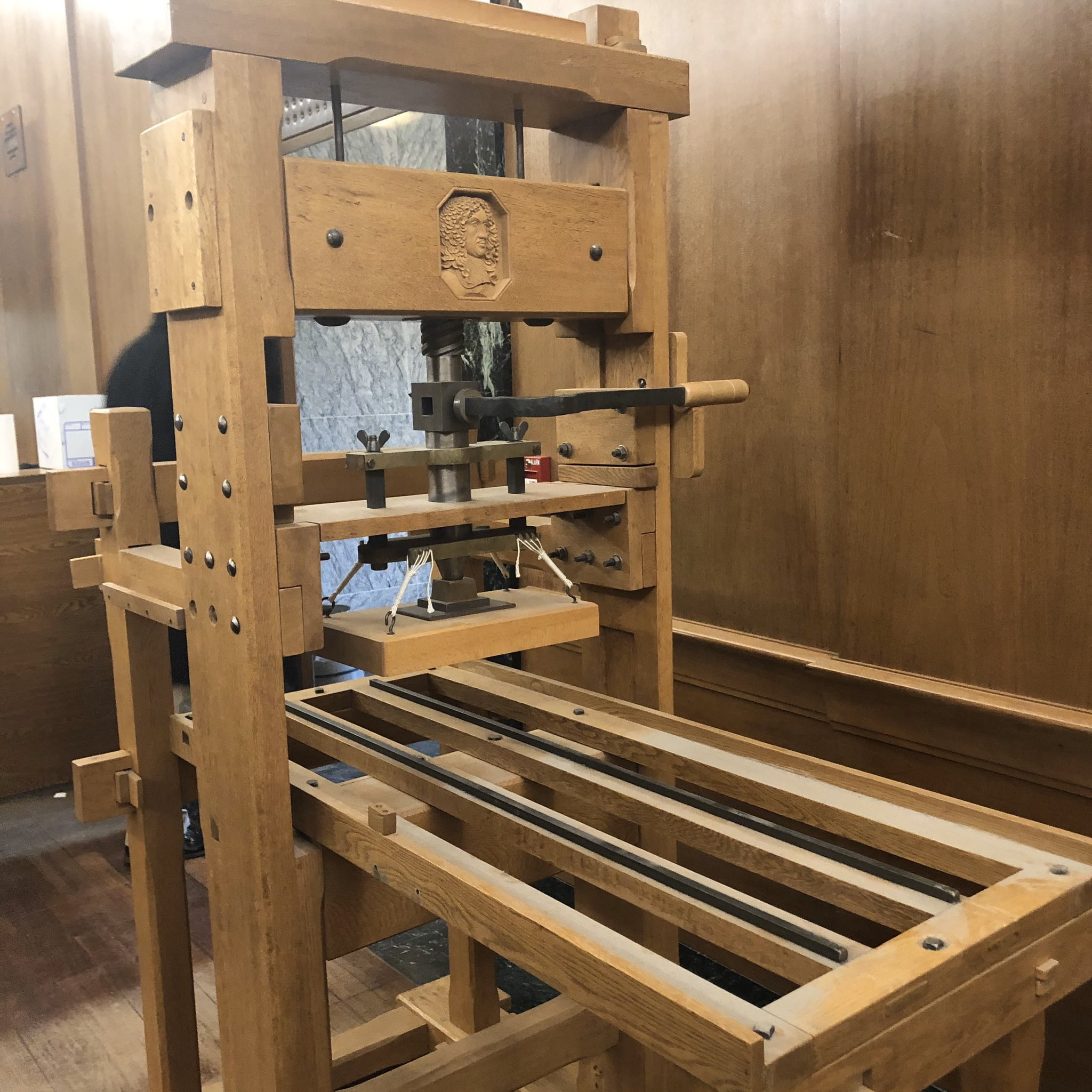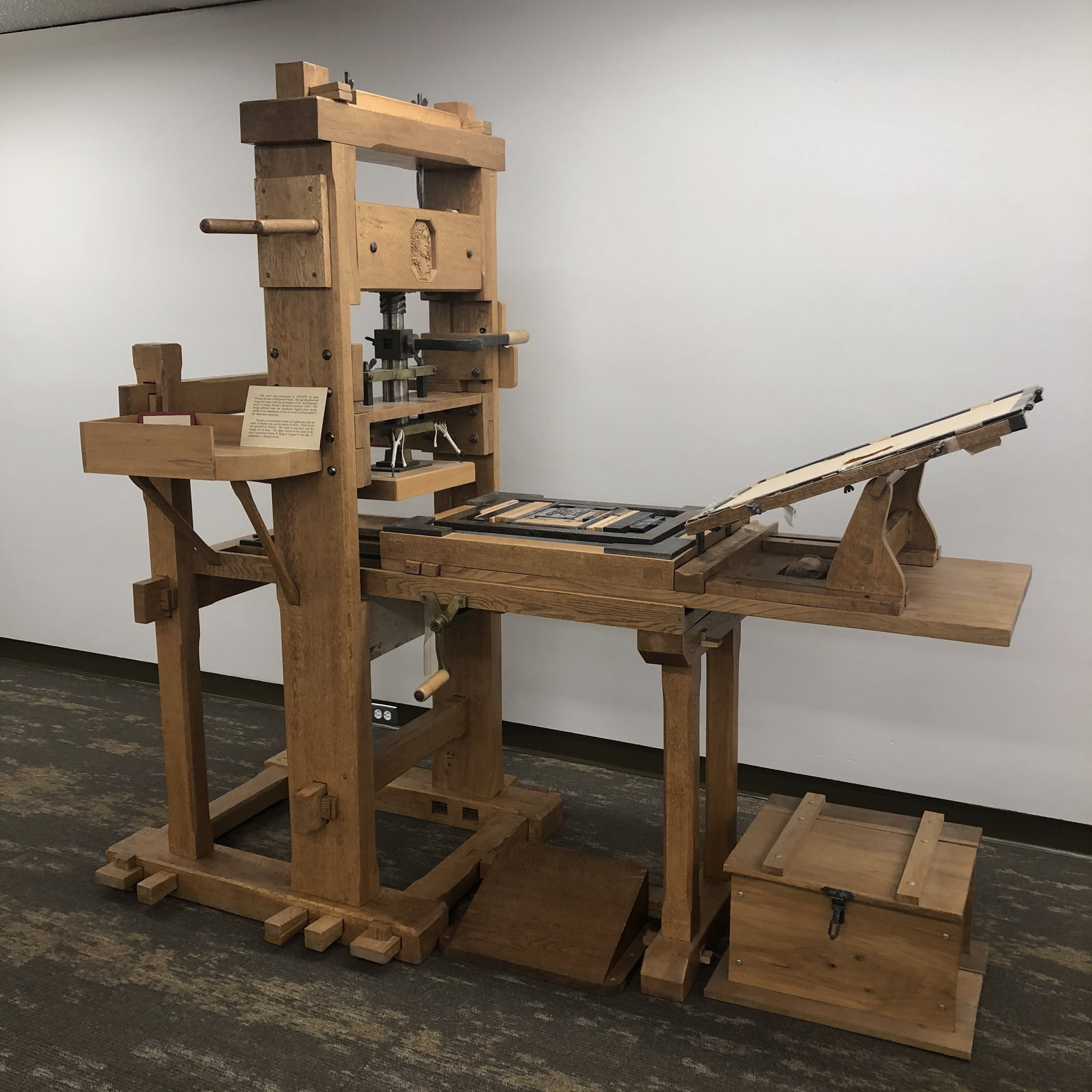 1200 East Seventh Street, Bloomington, Indiana, 47405 Notes: The hand printing press is a modern replica, built on the plan of the “new fashioned” press described in Joseph Moxon’s Mechanick Exercises (London, 1683). A full-scale working model, it is used for class demonstrations. It is known as the King’s Head Press because of the portrait of Charles II on the head. Literature: Photographs: medium size. Clicking enlarges in new window.