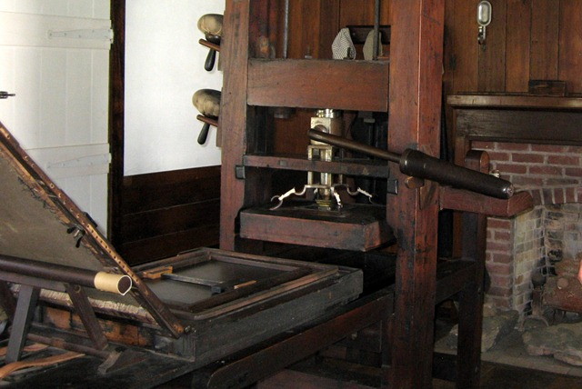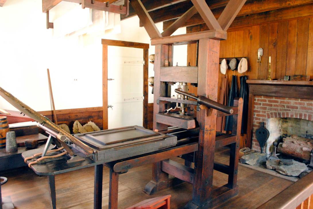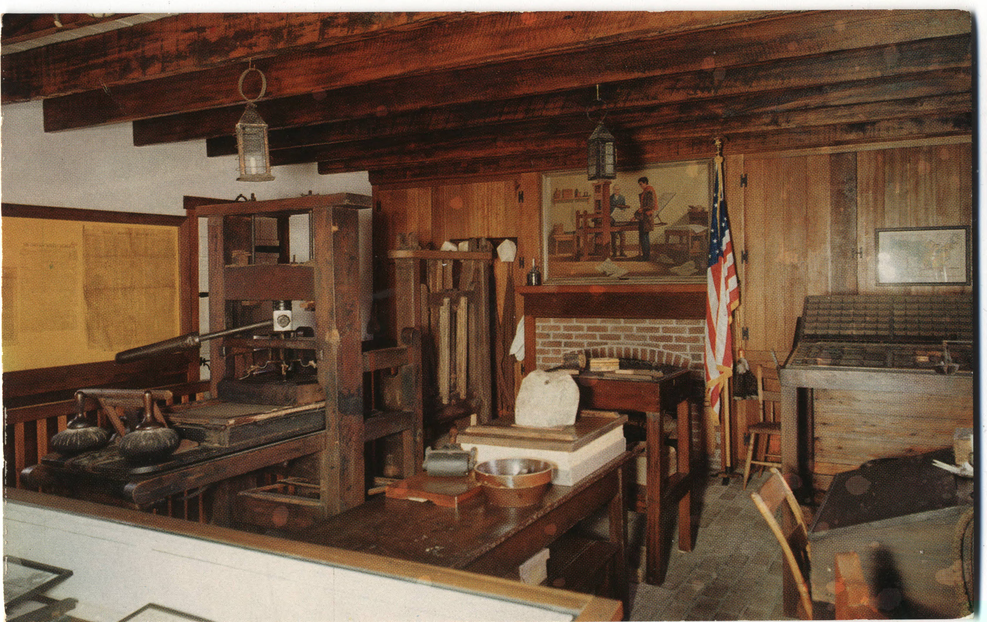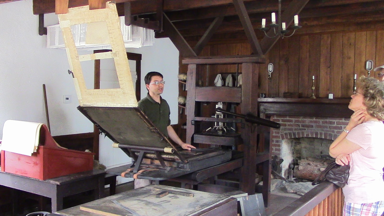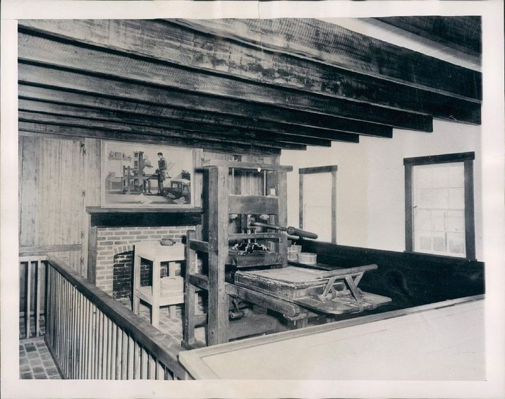 Location: Vincennes State Historic Sites: 1 W. Harrison St. Vincennes, IN 47591. Notes: The ‘Elihu Stout Print Shop’: Original Ramage press. Philip Gaskell (1970, p 31, USA15): ‘Built by Ramage, c. 1810. The property of John Wanamaker.’. The Indianapolis Star (October 14, 1947. p 14): “The Wanamaker store bought the press for Reid to use in his paintings and now will give it to Vincennes.” Vincennes State Historic Sites website:“Elihu Stout’s Print Shop represents the power of communication in westward expansion. As the country expanded westward, the distribution of information was crucial to the formation of states. In 1804, Gov. William Henry Harrison brought Elihu Stout to Vincennes to print the laws of the Indiana territory. Stout also printed the laws the legislature enacted to govern the new Louisiana Purchase lands. In July 1804, Stout started the Indiana Gazette, the first newspaper in Indiana, which ran for 41 years. Previously, Stout had been a journeyman printer with the Kentucky Gazette in Lexington, KY.”. Excerpts from Newspapers by Albert T. Reid (1947): A newspaper article states: “The press which Mr. Lincoln saw when his family stopped in Vincennes for repairs to their wagons was later destroyed by Confederate soldiers. Commissioned by an Indiana historical society to paint the Lincoln visit to the shop of the Vincennes Western Sun, Mr. Reid began a nation-wide search for a printing press like the one destroyed. His search ended in Reading, Pa., in a printing shop of Edward Smith. Mr. Smith’s press, which also will go to Vincennes for a Lincoln shrine, was one of the first presses made in this country by Adam Ramage, a Scotsman.”. Note about photos 1 and 2. “Above the fireplace is a painting of Elihu Stout showing the printing press to a young Abraham Lincoln, done at the same time.” The painting is by Albert Reid, “The Meeting of the Two Great Emancipators”. The painting was made in 1947, based on a sketch made in 1921. It depicts Abraham Lincoln’s March 1830 visit to the print shop of Elihu Stout. The painting is now in storage. The odd thing is that the composition of the sketch and the painting is the same, but the printing press is very different. Jim Steinhart took several photographs in 2011 that can be seen on his website: 1, 2, 3. A video of the printshop can be seen on YouTube (May 8, 2020). Literature: Gaskell, Philip (1970) ‘A census of wooden presses.’ Journal of the Printing Historical Society. 6. page 31. Natter, F.M. van (1947) ‘Meeting of Two Great Emancipators’. National Republic. page 13-14-32. Photographs: medium size. Clicking enlarges in new window.